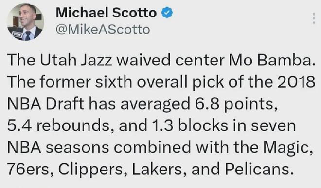 爵士官方宣布:穆罕默德·班巴将被解雇。在今年的季前赛中,班巴为爵士队打了一场比赛。对阵开拓者队不到9分钟的时间里,他得到8分3篮板2助攻1投。班巴出生于1998年5月12日,今年27岁。他是第18届首轮第6顺位。他身高2.13米,臂展2.39米。他才华横溢,是2K的模范儿子。出道初期,他被誉为下一个“魔兽”霍华德。然而,他至今还没有打过球,并且处于失业状态。值得一提的是,今年夏天休赛期,有CBA球队非常渴望与班巴合作。过去,他在与爵士队签约后就被暂时扣押。现在今年有空了,也许我们可以讨论一下中国的游戏话题。迄今为止,在NBA效力的短短7年里,班巴效力过五支球队,分别是魔术队、湖人队、费城队、快船队和鹈鹕队。他只打过预演因为爵士队的比赛,所以这不算数。常规赛,他场均上场16.8分钟,得到6.8分5.4篮板1.3盖帽,投篮命中率为47.7%。季后赛,他场均上场3.3分钟,只得到0分1篮板0.3助攻0.3盖帽。他的贡献可以忽略不计。事实证明,即使你有身体天赋,但没有高尔夫智慧和技巧,在NBA仍然很难生存!
